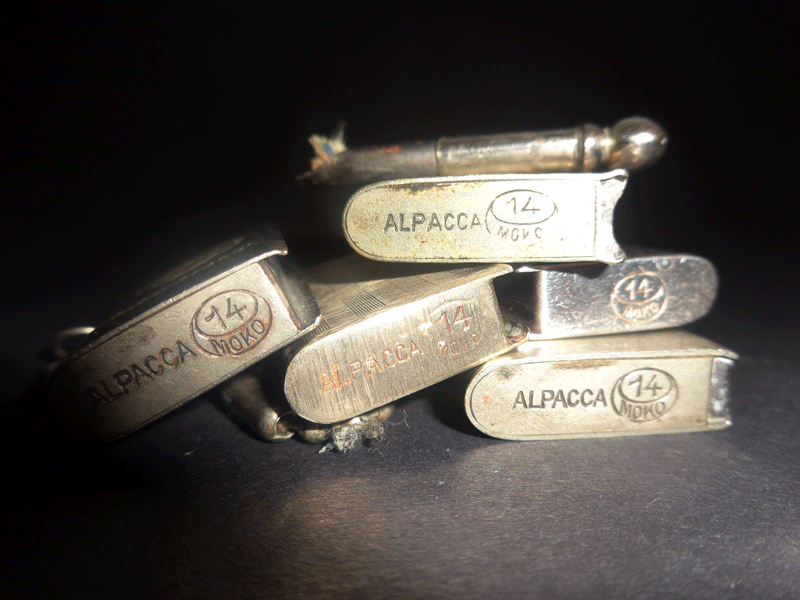 The Alpacca alloy was developed in 1823 by the German chemist Dr. Ernst August Geitner (1783-1852). It was very similar in its appearance to silver, but significantly cheaper. Therefore, this new alloy was first called "Argentan". It consisted of 20% nickel, 55% copper and 25% zinc. The new silver-imitating alloy soon became very popular. The Gebrueder Henninger (Henninger Bros.) proposed a similar alloy (5-30% nickel, 45-70% copper and 8-45% zinc with trace amounts of lead, tin and iron) which they called "Neusilber". Later both Argentan and Neusilber were used under the trade name of Alpacca (or Alpakka). The great advantage of the use of Alpacca alloy as the base metal for silver plating is that the appearance of the objects does not change significantly with the wearing away of the silver layer. NOW A LITTLE ABOUT THE NAME ON THE BOTTEM OF THE LIGHTER MOKO