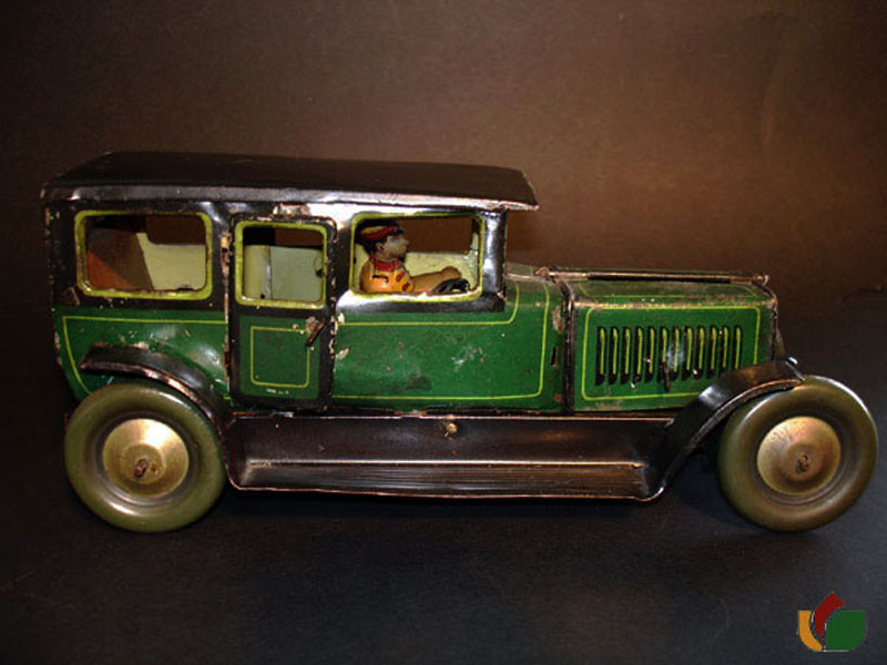 Germany clockwork vehicles 1920 by Moko Top is the double hinged hood that when opened reveals the 6 working cylinders that move up and down when the car is driving along by its clockwork motor. Key wind -key is permanently attached to the toy.9 1/2" long has a driver inside the car,2 doors open and close with tiny attached handles. Has a lever on the drivers side for the gears. Dark Green with Yellow pin stripping. The undercarriage has the litho tail pipe.Toy has forward -neutral -reverse. Very well taken care of- Spring works good- car has a lot of go power! pistons go up & down- doors open & close. WONDERFUL EARLY TIN WORKING TOY.